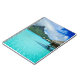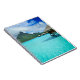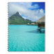 Caderno com um recurso do bungalow do overwater da lua de mel na lagoa do azul de turquesa da ilha do Pacífico de Bora Bora, perto de Tahiti em Polinésia francesa.