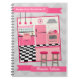 Um caderno espiral da receita que caracteriza uma ilustração de uma cozinha inspirada retro com um rosa, umas cinzas, e um preto. O fundo é ziguezague cinzento. Personalize com seu nome.