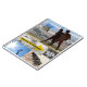 Um caderno com um cobrir que caracterize diversas fotos da rota da peregrinação de Camino de Santiago, incluindo fotos de um waymark do escudo de scallop, uma estátua do peregrino, a catedral de Santiago, uma seta amarela, uma cruz de St James, e caminhando botas.