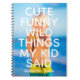 Caderno de foto personalizado com o texto "coisas fofas, engraçadas, loucas que meu filho disse" em branco (cada linha de texto pode ser alterada para qualquer cor clicando no botão para editar o design) e o nome do seu filho ou filha. Envie sua foto favorita e receba um caderno único para você ou como presente para a mamãe e o papai.