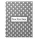 Este caderno espiral customizável caracteriza um impressão bonito das bolinhas das cinzas e do branco com um ponto para personalizá-lo com seu próprio texto. Apenas bata o botão do personalizamento para dar entrada com seu nome ou deseje o texto na caixa. Você pode mudar a pia batismal e a cor da pia batismal se você deseja batendo o botão da personalização.