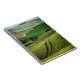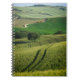 O caderno com uma paisagem quase abstrata com Linhas Verdes curvy na cevada coloca entre o d'Orcia de Pienza e de San Quirico no vale do d'Orcia de Val em Toscânia, Italia.
