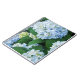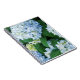 O caderno mostrado com um impressão da foto do hydrangea azul bonito floresce.
