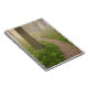 Caderno com um trajeto de passeio com os bluebells que conduzem em uma floresta no nascer do sol em uma manhã nevoenta, criando uma atmosfera mágica.