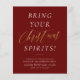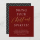 Convide amigos ou colegas para comemorar a temporada com estes convites de festas de cocktail elegantes! Design apresenta um fundo vermelho arrojado profundo com "traga seus espíritos!" em letras negrito itálicas brancas e "Natal" em letras de ouro cômico. Os detalhes do evento aparecem abaixo na tipografia serif clássica. Cartões invertendo para um fundo preto elegante com um padrão de floco de neve deco branco. Como parte da seleção orçamentária no Zazzle, esta folha não é um tamanho de convite padrão ou qualidade de papel. Se quiser que este design num cartão de convite o encontre na nossa loja ou utilize o Zazzle Make Machine para o transferir para o produto da sua escolha. Sinta-se à vontade para me contactar com quaisquer perguntas - terei todo o prazer em ajudar!