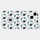 Esta capas de iphone temática de futebol divertido apresenta um padrão simples de bolas de futebol que têm painéis brancos, pretos e brancos num fundo branco personalizável - personalizado com o monograma do atleta - por katz_d_zynes