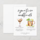 Esta lista de coquetéis de assinaturas chic apresenta uma simples tipografia negra acima de 2 bebidas e seus ingredientes para seu bar de casamento. Um espresso martini e um desenho da mula de Moscou adicionam um talento legal à sua folha de menus de bar. Preencha com os nomes dos casais e a data para sua recepção.
