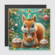 Esquilo encantador usando um chapéu festivo de festa, cercado por decorações vibrantes e cupcakes coloridos em um ambiente alegre e divertido.
