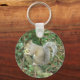 Este chaveiro bonitinho mostra uma fotografia de um esquilo de cinza fofo agarrado a uma bolota e sentado numa árvore na floresta.
