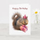 Um esquilo vestindo uma festa que tem um presente de aniversário embrulhado neste doce cartão de aniversário. "Feliz Aniversário" ou personalizar para escrever suas próprias palavras.