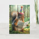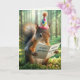 Um esquilo fica em uma floresta iluminada pelo sol, vestindo um chapéu festivo enquanto segura um cartão de aniversário. O texto dentro pode ser alterado.