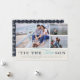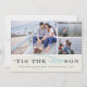 Um cartão de feriado náutico bonito apresenta três das suas fotos favoritas em um layout de colagem, com a inscrição "é o SEAson" em azul marinho e aqua em uma faixa de marfim quente de praia. Adicione uma fotografia e uma mensagem adicionais ao fundo, sobre um padrão de fundo de âncoras e rodas do navio em marinho e branco.