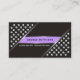Pernos metálicos prateados e faixas diagonais cartões de visitas roxas pretas, com dois triângulos cobertos com pernos metálicos em dois cantos do cartão, faixas diagonais de prata e uma banda roxa lavanda no centro com seu nome. Fundo preto.