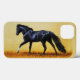 Pintura de um belo garanhão preto com uma cauda longa e fluindo galopando por um campo de grama. Trabalho de arte realista criada de uma pintura original de óleo pelo artista equino e da fauna selvagem Crista S. Forest.