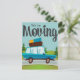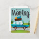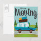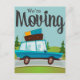 Certifique-se de que todos saibam seu novo endereço quando você se mudar. Cartoon com malas em cima. Pinheiros no fundo. "Estamos nos movendo" acima