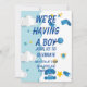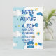 Estamos tendo um convite para chá de fraldas, azul e branco com mamadeira de bebê, brinquedos, roupas e muito mais! Tão fofo para comemorar um menino!