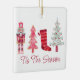 Um "Esta é a estação" que diz o ornamento da árvore de Natal com símbolos amados dos feriados de Natal em cor-de-água rosa e vermelha. Árvore de Natal, biscoito de Natal, soldado de brinquedo maluco, estocagem de Natal. Algumas das suas coisas favoritas.