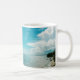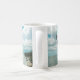 Presente de caneca cristã com escritura, "Fique quieto e saiba que eu sou Deus. Salmo 46:10". Um lago pacífico com água azul calma e céu cheio de nuvens é a imagem que envolve a caneca. Escolha entre dois tamanhos e mais cores e estilos.