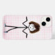 Garota fixe com óculos, cabelo e tênis azuis em um padrão de gingham rosa e branco. O plano de fundo pode ser alterado.