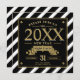 Estilo Art Deco Cartões e envelopes Dourados de Convite de festas de ano novo e preto. Um fundo preto-e-branco riscado com letras negras e douradas formais. Perfeito para um evento formal de gravata negra/champanhe. Concebido por Jacqueline. Personalizado por você.