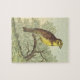 Esta quebra-cabeça de aparência vintage apresenta uma representação de um pássaro empoleirado em um galho.