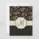 Um padrão floral ao estilo da Europa Oriental de flores vermelhas e azuis e folhas verdes e marrons sobre fundo preto acastanhado, com um design digital de faixa envelhecida a preto no fundo, sobreposto por uma fita e um selo monográfico personalizável.