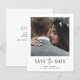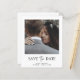 Este simples e elegante orçamento de casamento preto e branco salve o cartão de data com sua foto pessoal na frente, com uma mistura de moderno roteiro manuscrito e texto ousado do serif. Há espaço para informações adicionais no verso, incluindo o seu site de casamento.