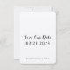 Este cartão de data é simples da forma mais perfeita. As fontes pretas e brancas balanceam as cores na imagem. Mostre sua foto favorita da sua sessão de noivado ou sua proposta com seu nome e data. Vai parecer excelente em todo o seu frigorífico. São acrescentados detalhes adicionais ao verso para manter a natureza simples da frente do cartão.