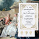 Um convite de casamento elegante e ornamentado ao estilo Rococo, com um tom de cinza azul muito leve. Formação dupla em tons dourados e caligrafia de ornamentado. Um convite especial para o seu dia especial. Imagem de fundo é uma pintura de Jean-Francois de Troy 1679-1752 pintada em 1831, dominio público.
