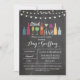 Chalkboard estoque o convite da festa do bar com luzes de cordas e uma seleção de garrafas e óculos. Perfeito para um noivado, um chá de casais ou uma equipe do bar, altere o texto para se adequar ao seu partido.
