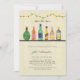 Os convites para o chá de casamento de bar apresentam licor de aquarela e garrafas de vinho numa prateleira com luzes de corda penduradas acima e padrão festivo da garrafa atrás. (arte original de Shelley Winters Design)