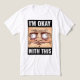 Libere seu caos interior com essa camiseta hilária e ligeiramente descontrolada no estilo meme! Com a frase **"EU ESTOU BEM COM ISSO"** acima e abaixo de um rosto com olhos selvagens de desenho animado, essa camiseta é perfeita para qualquer pessoa que está lidando com a vida um momento estranho de cada vez.