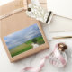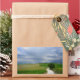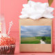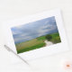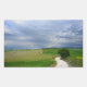 Um autocolante de fotos retangular de uma enrolada estrada de terra 'strada bianca' com muitas curvas através dos campos verdes numa paisagem na Toscana com uma árvore ao longo do caminho e lindas nuvens no céu levando a um destino distante. Uma analogia para alcançar seu objetivo.