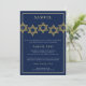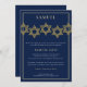 Convite elegante e moderno de Mitzvah do bar, caracterizando um teste padrão da estrela de David do ouro através da parte superior. Personalize facilmente este modelo do convite do mitzvah do bar com detalhes importantes do evento da sua criança.