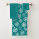 O conjunto de toalhas temidas de inverno mostra um padrão de estrelas de neve em um fundo de turquesa.