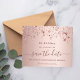 Uma cinta e moda Salve a placa Date para uma festa de aniversário 50th (ou qualquer idade). Um fundo cor-de-rosa feminino, rosa dourado, decorado com estrelas rosa douradas. Personalize e adicione uma data e nome/idade 50. Letras rosa escuras de cor dourada. O texto: Salvar a Data é gravado com um script de estilo com letra de tendência grande.