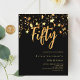 Um convite moderno e na moda para uma 50ª festa de aniversário para ele e para ela. Decorado com estrelas ouros. Fundo preto e a palavra Cinquenta escrita com letras douradas falsas grandes. Personalize e adicione um nome e detalhes da parte. 1 folha = 1 convite impresso de borda a borda.