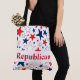 Esta bolsa de tote de grande tamanho é mostrada com estrelas patrióticas impressão com texto republicano. Personalize este item ou comprar como está.