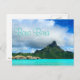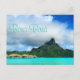 Cartão-postal de um resort aquático na fantástica lagoa turquesa de Bora Bora com Mt. Otemanu ao fundo na Polinésia Francesa perto do Taiti com o texto: Bora Bora.