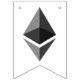 Esta bandeira de festa Bunting exibe o ícone Ethereum com cores cinza e preto neste tema e estilo inspirados no blockchain/cryptomoeda Bitcoin. Todas as bandeiras têm impressão unilateral segura para uso ao ar livre, feitas com plástico poliestireno resistente e corda de plástico grossa, tendo (16) bandeiras swallowtail de 5,5" x 8" em uma corda de 6' de comprimento.