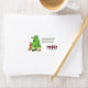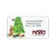 Nessas etiquetas de endereço de retorno está uma imagem de um cachorro Airedale Terrier vestindo um cachecol vermelho de Feriado. O cachorro se senta entre pacotes de presentes envoltos ao lado de uma árvore de Natal decorada. Um pássaro toucinho está pousando na árvore atrás dele. Seu texto personalizado fica verde à direita da imagem, e o texto estilizado na parte inferior diz MERRY CHRISTMAS".