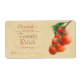 Uma ilustração de um monte de tomate vermelho com folhas verdes, sobre fundo bege com texto cor russet, feito de uma pintura digital e foto. O rótulo é estabelecido para enlatar ou engarrafar casas de vernizes, chutins, ketchup e conservas. Você pode deixar o espaço de data para gravar ou alterar para a data em que o produto foi fabricado.