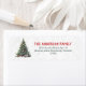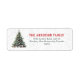 Uma árvore de Natal decorada com neve e flocos de neve caindo. Personalize com seu nome e endereço. Cores tradicionais; Vermelho e verde.