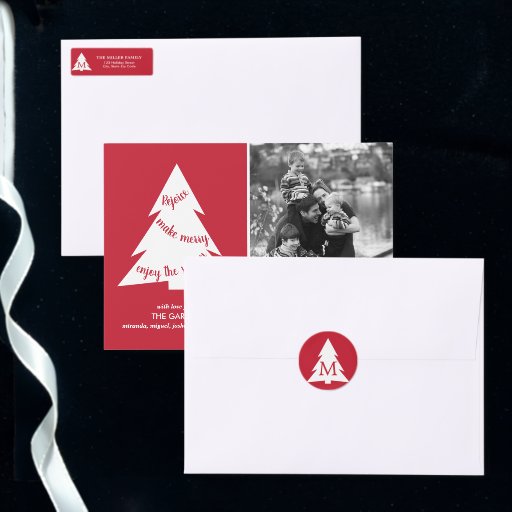 Adicione um sotaque moderno aos envelopes de cartão de feriado e ao correio com etiquetas de endereço de retorno personalizadas, com uma árvore geométrica branca com um monograma em fundo vermelho. Personalize-o adicionando seu nome inicial e endereço na barra lateral. Para ver as árvores brancas design no padrão de Natal vermelho em outros itens, clique no link "Artes Rocklawn" abaixo. Imagem criada digitalmente. Copyright ©Claire E. Skinner. Todos os direitos reservados.