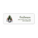 Três gnomos de Natal bonitos em frente a uma árvore de Natal devolvem etiquetas de endereço personalizadas com seu nome e endereço.
