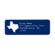 Mapa branco simples da forma do estado do Texas com um rótulo de endereço em um estilo de fonte datilografado para suas informações de contato. Altere o estilo, tamanho e cor da fonte para criar seu próprio design. Você não precisa ficar com o tema azul e branco da bandeira. Você também pode personalizar a cor do fundo.