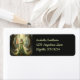 Uma bela fada vestindo um vestido verde-claro fluente e joias feitas de peridôs com pedras peridot em seu longo cabelo verde-claro e asas translúcidas como a libélula, segurando um gladiolus caminha em uma floresta mágica cercada por flores rosa e azuis e árvores cobertas de videira.