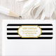 Etiquetas de endereço de volta de Natal com padrão de listras preto e branco e detalhes dourados.