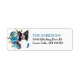 O lado esquerdo dessas etiquetas de endereço de retorno apresenta uma bela imagem aquosa de um cão Collie da borda preto e branco emergindo de um buquê de flores azuis e roxas. Seu texto personalizado está em azul e preto à direita.