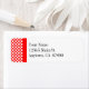 Um rótulo de endereço de retorno personalizado com pontos polka brancos simples em vermelho com letras simples em bloco. Clique em Personalizar para alterar fontes, cores de fundo, tamanho do rótulo e muito mais, até salvar seu design para mais tarde.